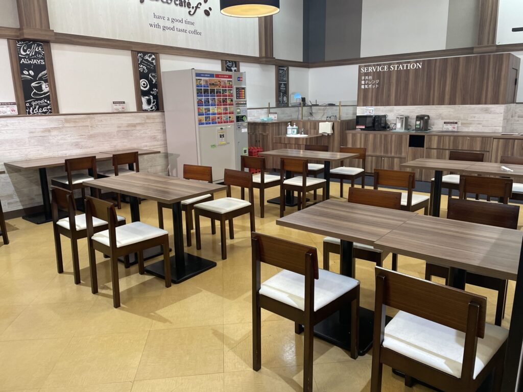 売り場のすぐ横にイートインスペース(テーブル3〜4席程度)があり、ドリンクの自動販売機もあります。手洗い台、電子レンジ、電子ポットもありますのでとても便利です。