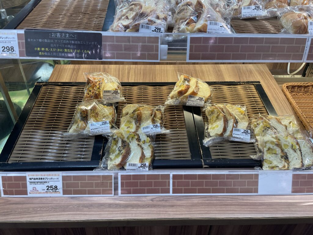 フジグランナタリーはJR阿品駅・広電阿品電停と連絡通路で直結しており、雨の日でも濡れずに訪問できます。広い駐車場も備わっているため、車でのアクセスも問題なし。国道2号線沿いという立地のわかりやすさも好評でした。生鮮食品売場に隣接しているので、食材の買い物と一緒にパンを選ぶこともできて効率的です。