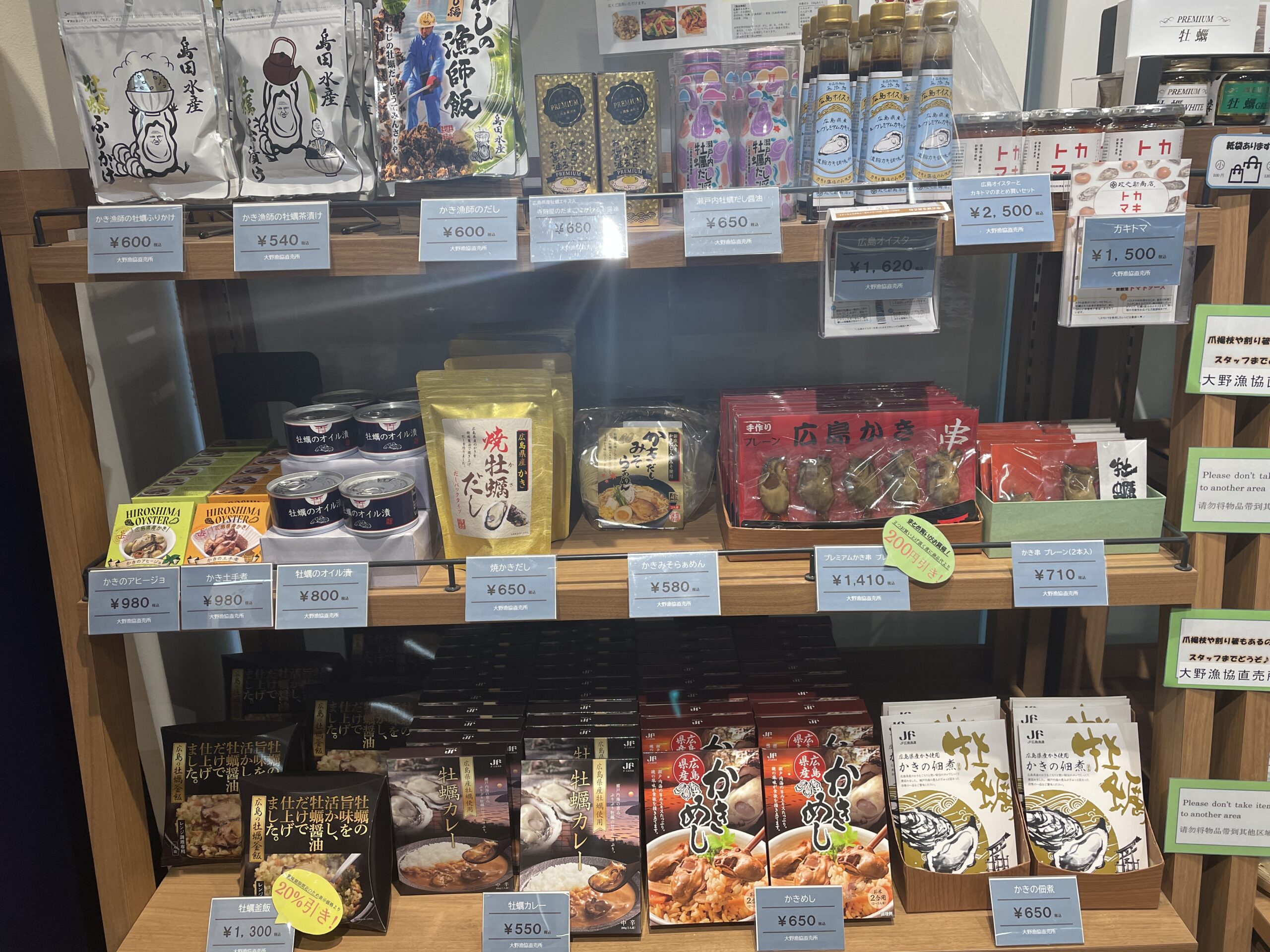 店内に入ると、牡蠣に関係するお土産の種類の多さに驚かされます。オイル漬け、がんす、冷凍牡蠣など、様々な形で牡蠣を楽しめる商品が揃っています。それぞれの商品には、おすすめの食べ方がポップアップで記載されているため、購入時の参考になります。