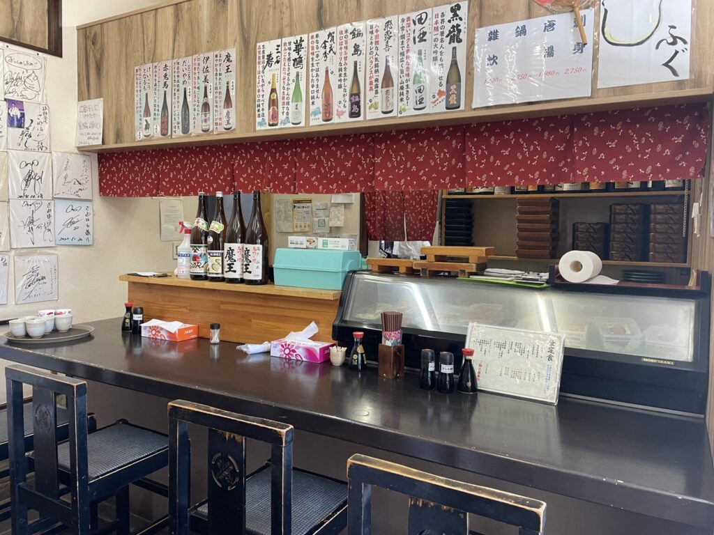 入り口には「オススメの日替わり」がホワイトボードに手書きで書かれており、入店前にその日の目玉メニューをチェックするのが常連流のようです。元気の良い「いらっしゃいませ」の声に迎えられて店内へ。カウンター席が4席あり、他にテーブル席と座敷席も確認されています。