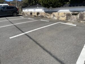 お店は石内エリアの住宅地に位置しています。駐車場は入り口手前に3台分、さらにその奥にも停められるスペースがあり、約10台分の駐車スペースが確認されています。車でのアクセスが基本となるエリアで、駐車場があるのはありがたいポイントです。