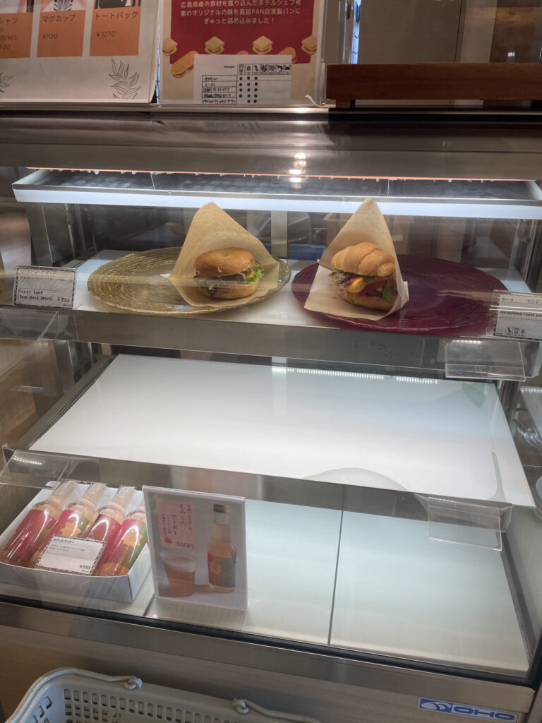 塩あんバターは、明治創業のもみじ饅頭店・博多屋のこし餡を無塩バターと一緒に塩パンにサンドしたコラボパン。宮島らしさを感じられる一品です。サンドイッチは広島県産の食材を盛り込んだホテルシェフ考案のメニューで、日替わりのため何があるかはお楽しみ。