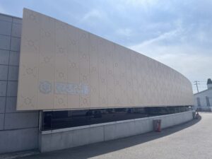 おおのファクトリーは、国道2号線沿い・セブンイレブンと同じ広い敷地内にあります。駐車場は大型バスも停められる規模で、車での来店がメインの立地です。