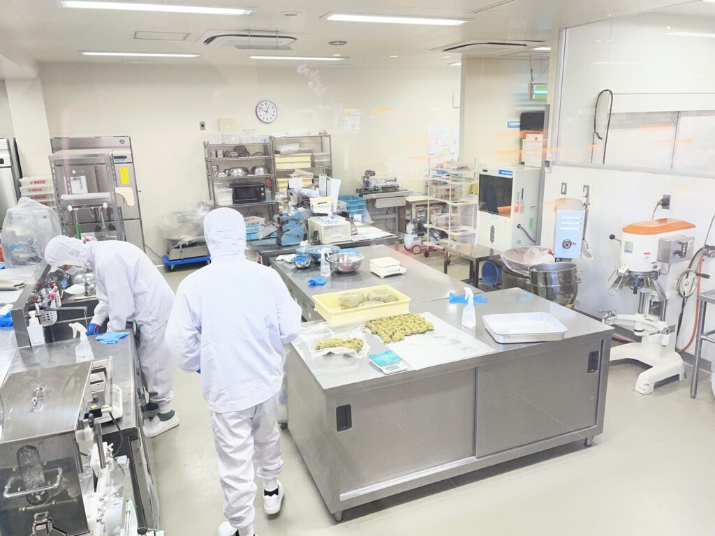 おおのファクトリー最大の特徴のひとつが、無料の工場見学です。公式サイトによると、所要時間は約40分。流れはまずビデオ鑑賞から始まり、生餡や生地作りから焼成・包装・刻印まで一連の工程を映像で解説してもらえます。そのあと、ガラス越しに実際の製造ラインを見学。もみじ饅頭・桐葉菓をはじめ、焼和菓子「御笠の老松」やどら焼き「みやじま御笠」などの手作りお菓子の製造工程も見られます。