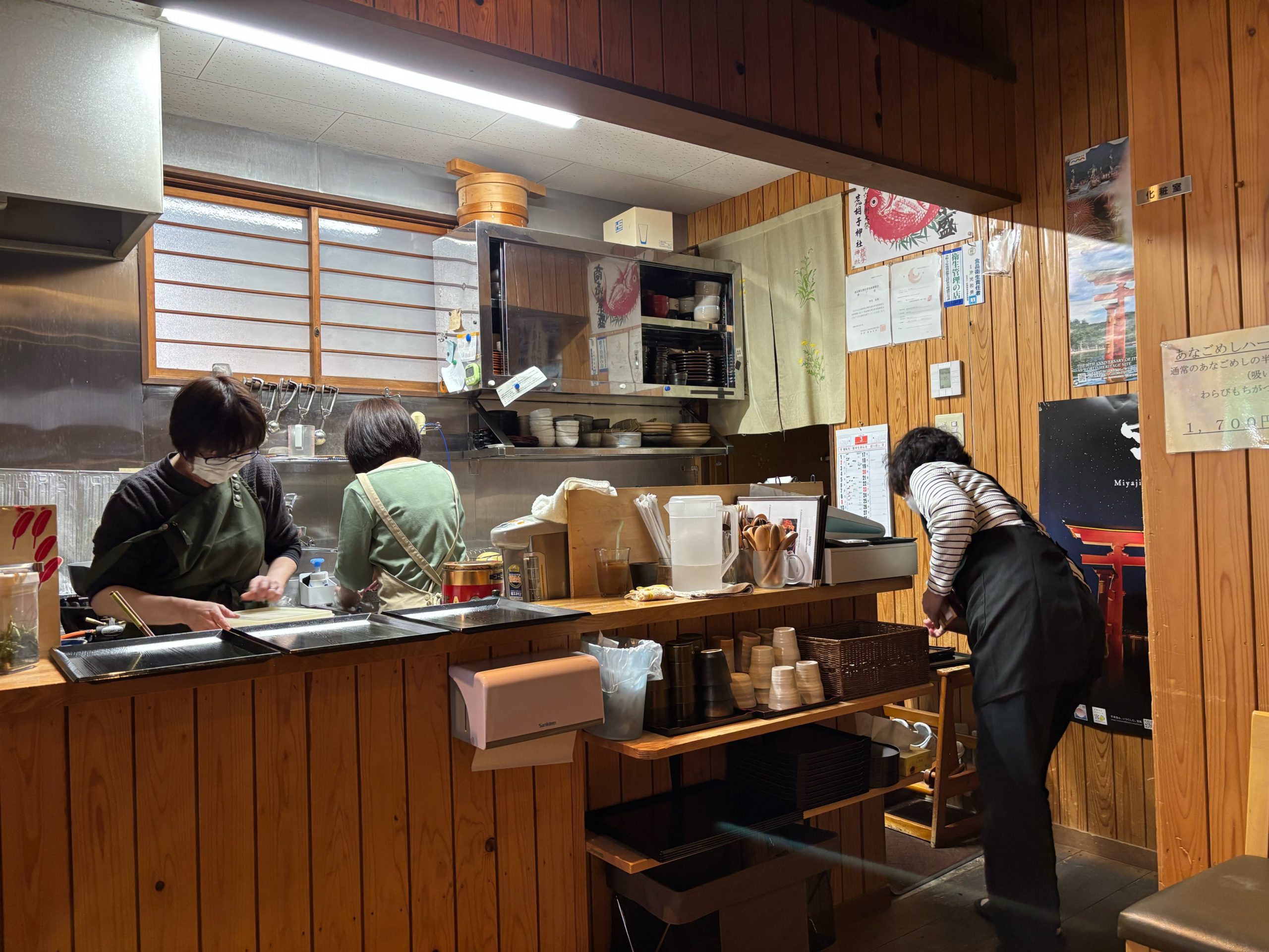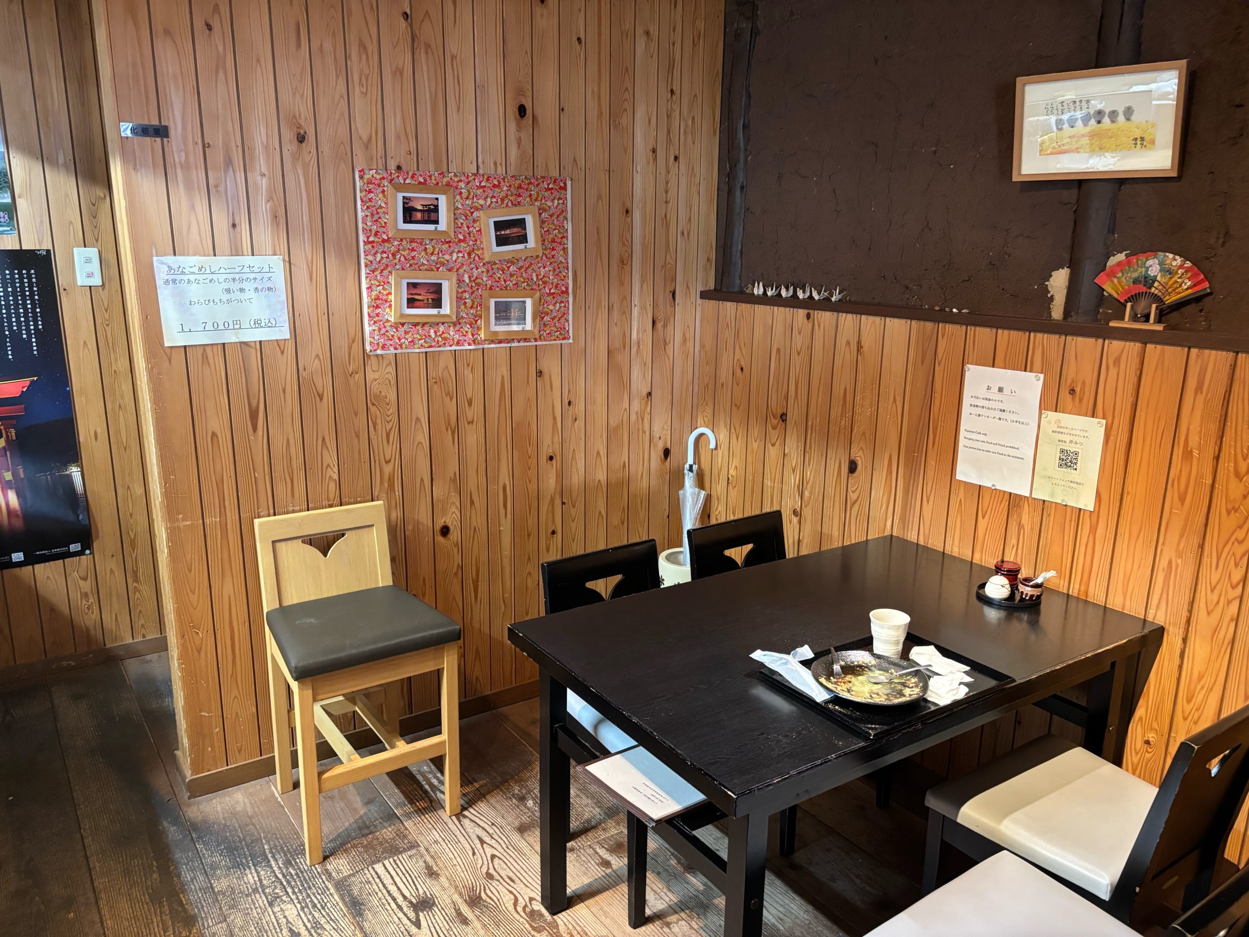 筆者の感想:外から見える緑ののれんが印象的で、暖簾をくぐると木の香り。観光地にありながら、ふっと肩の力が抜けるような空気が漂います。歴史を感じる空間で茶をすする体験は、宮島らしさを濃くしてくれる”もう一つの参拝”のようでした。静けさと温かさが同居する、再訪したくなる店です。