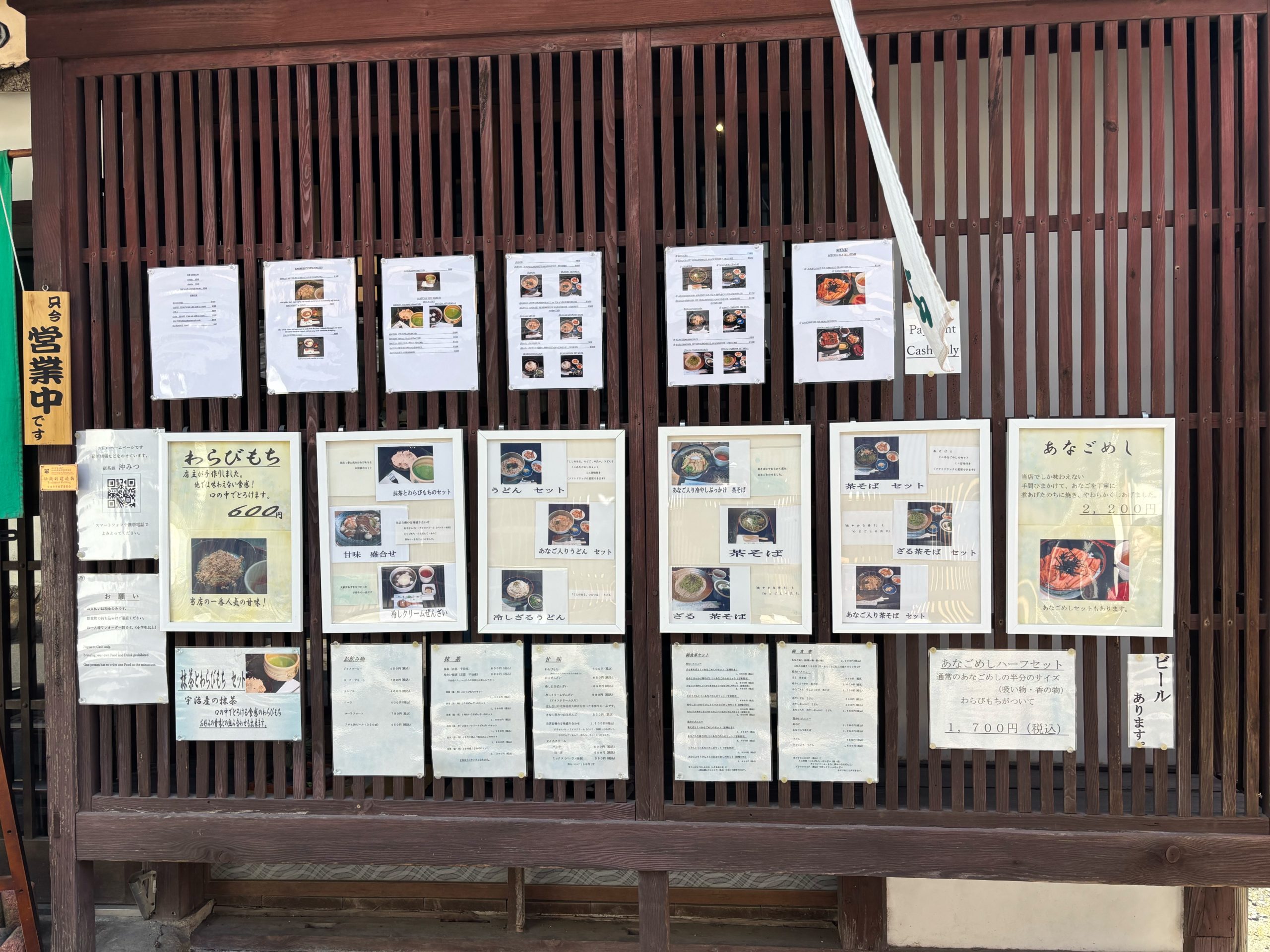 食事は税込表記で、茶そば・うどんは温・冷から選べます。看板は「限定あなごめし」「あなごめし(2200円)」「あなご入り茶そば(1750円)」「茶そば(1000円)」「うどん(850円)」「あなご入りうどん(1650円)」。ふっくら炊いたあなごに、香り高いご飯とタレが重なり、宮島ならではの満足感を運びます。