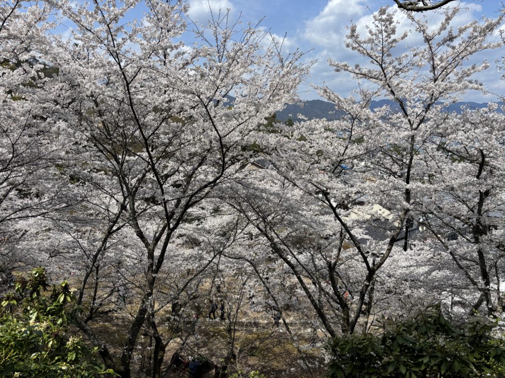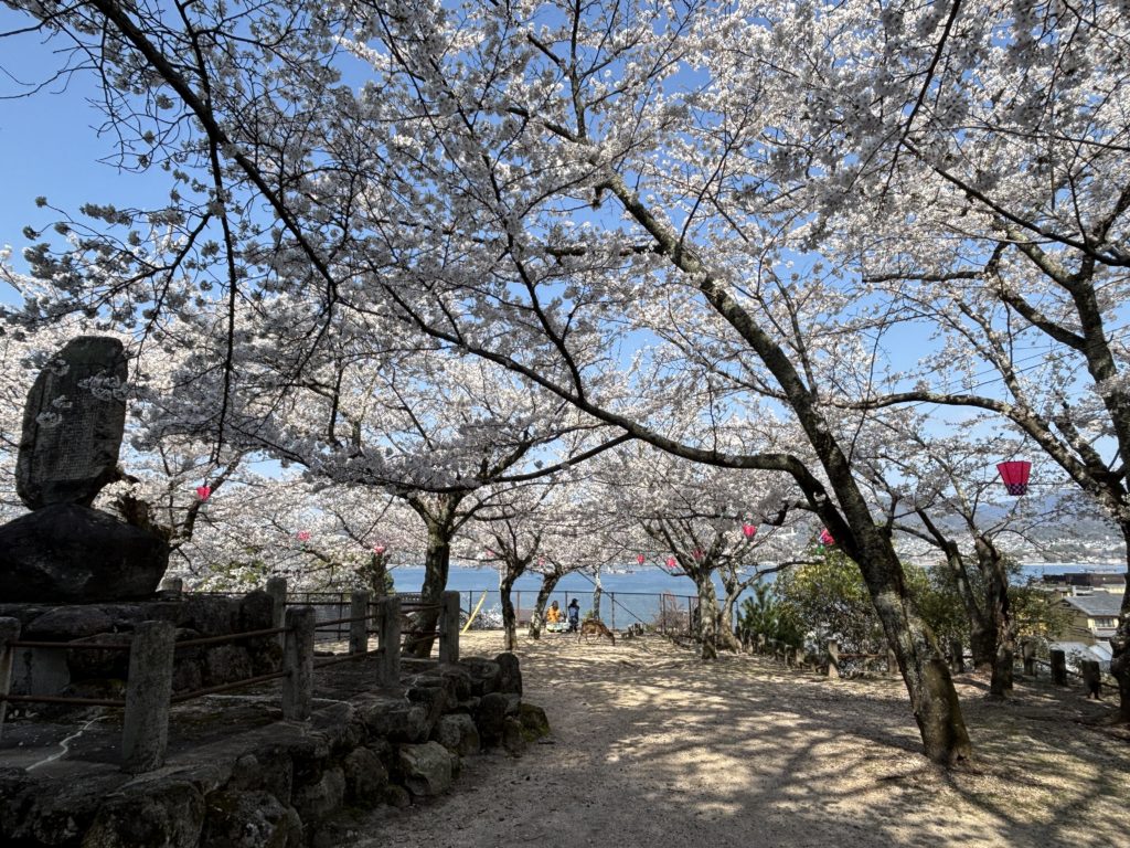 実は地元民の間では「桜の穴場は多宝塔周辺」って言われてるんですが、2025年は工事中なので大元公園が一番のおすすめ。鹿の出没率も高く、背景に海と桜が入るためフォトジェニックです。