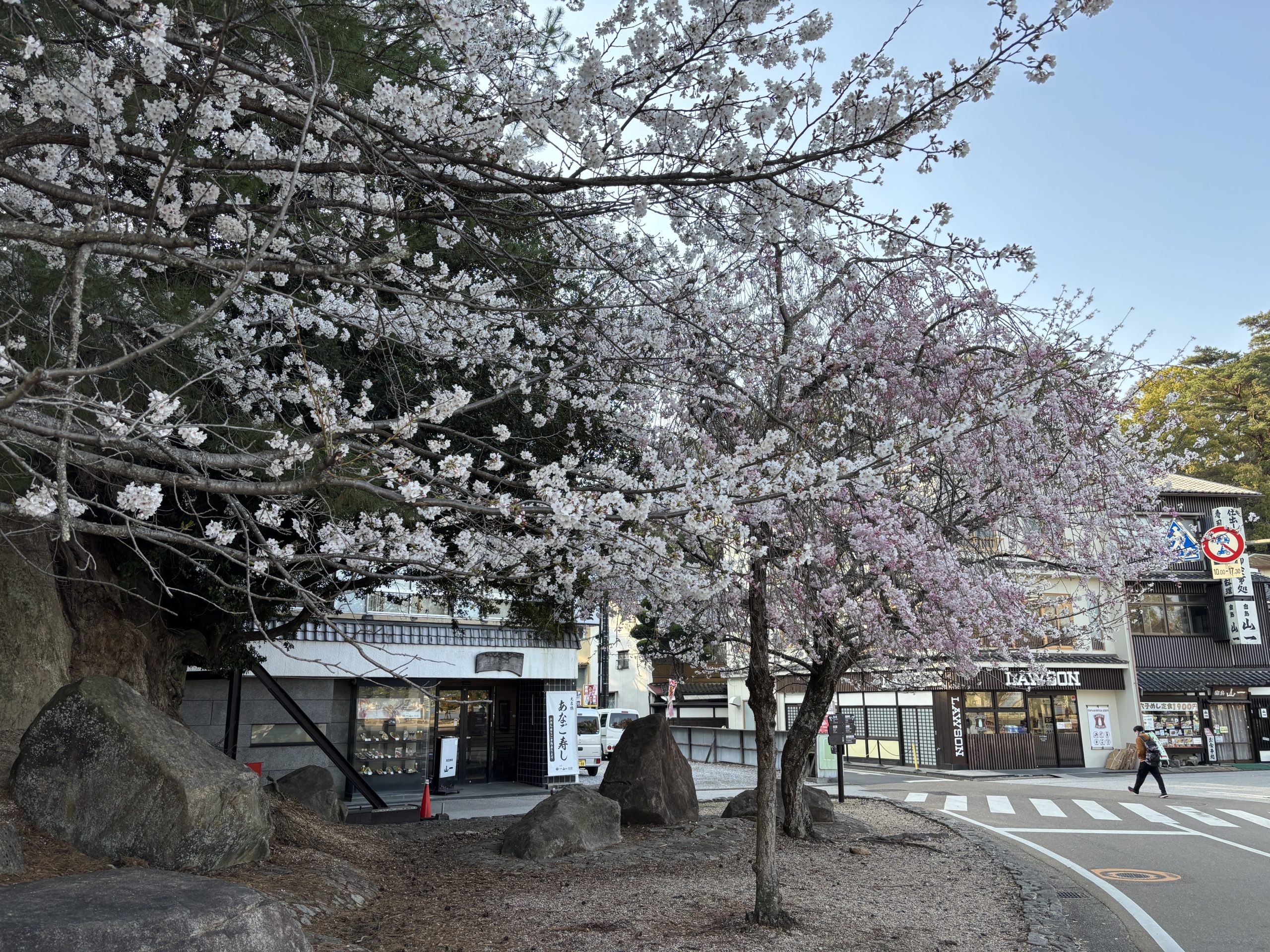 うちの家族は古径を通って厳島神社へ向かうのがお気に入りコース。石畳が少し歩きにくいですが、歴史を感じながらの桜散歩は格別です。