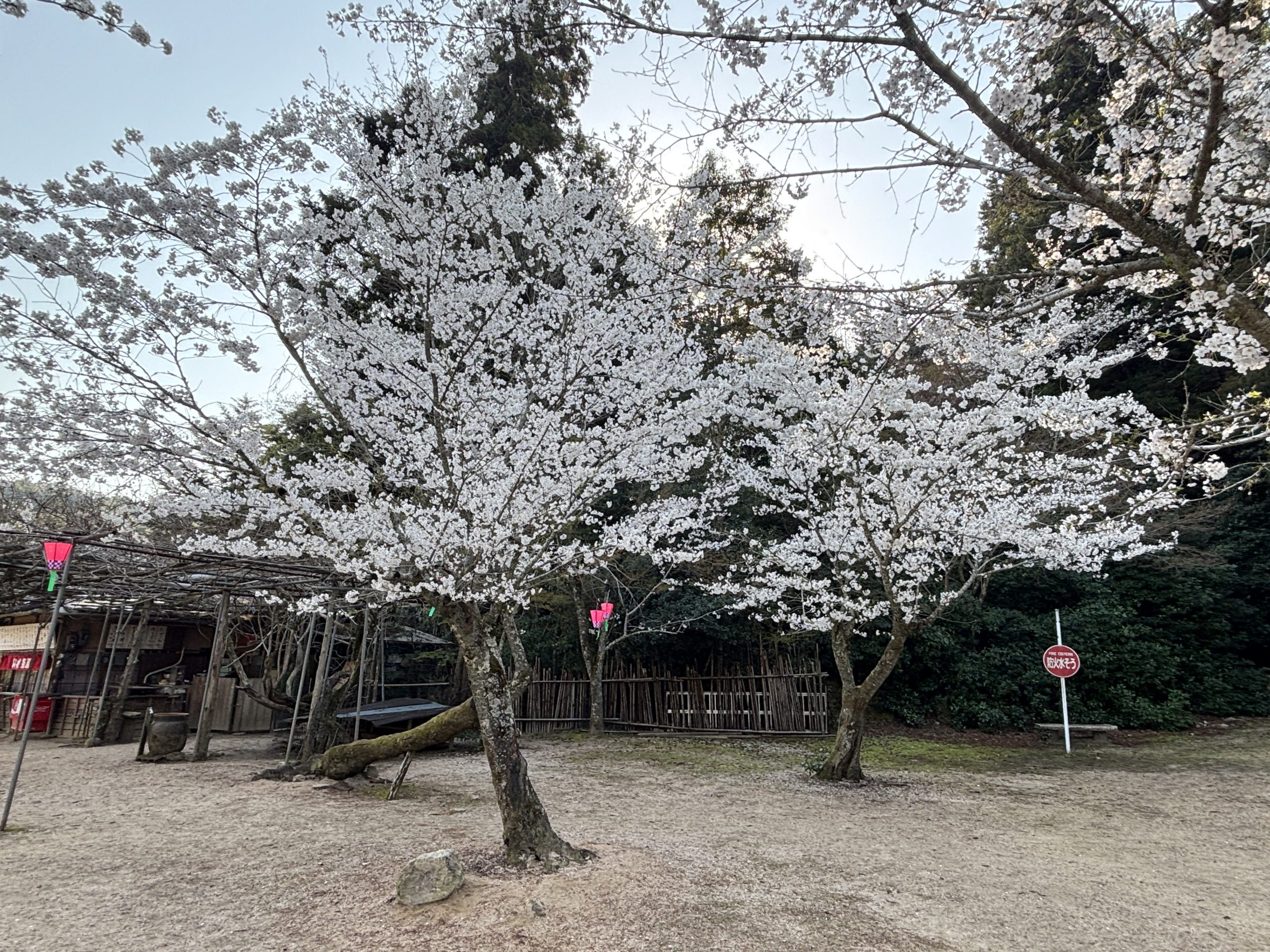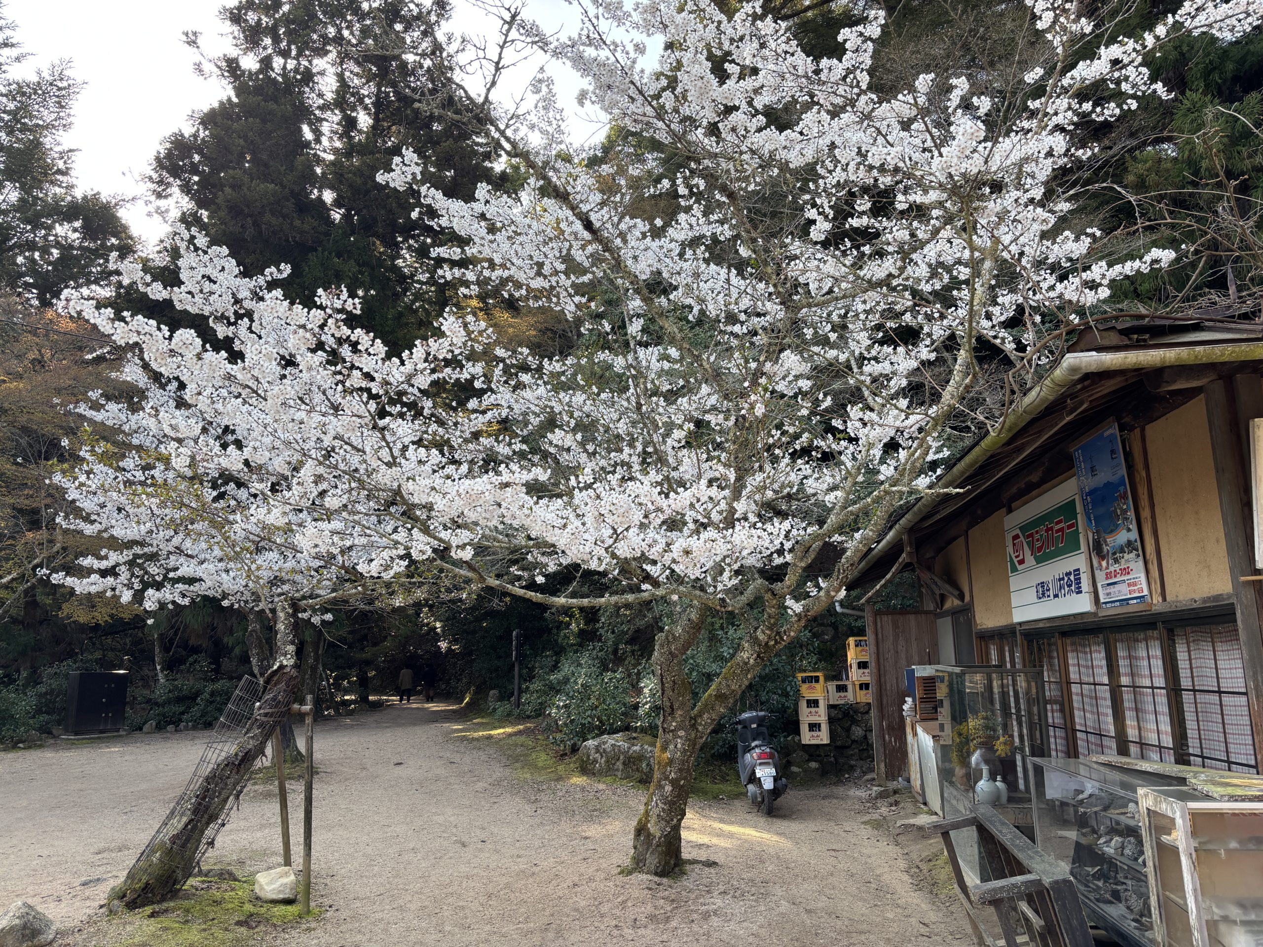 ロープウェー乗り場の途中にあるお店で、「山村茶屋」があります。鹿がゆっくりしていて可愛らしかったです。人が少ないので桜の景色を独り占めできました。