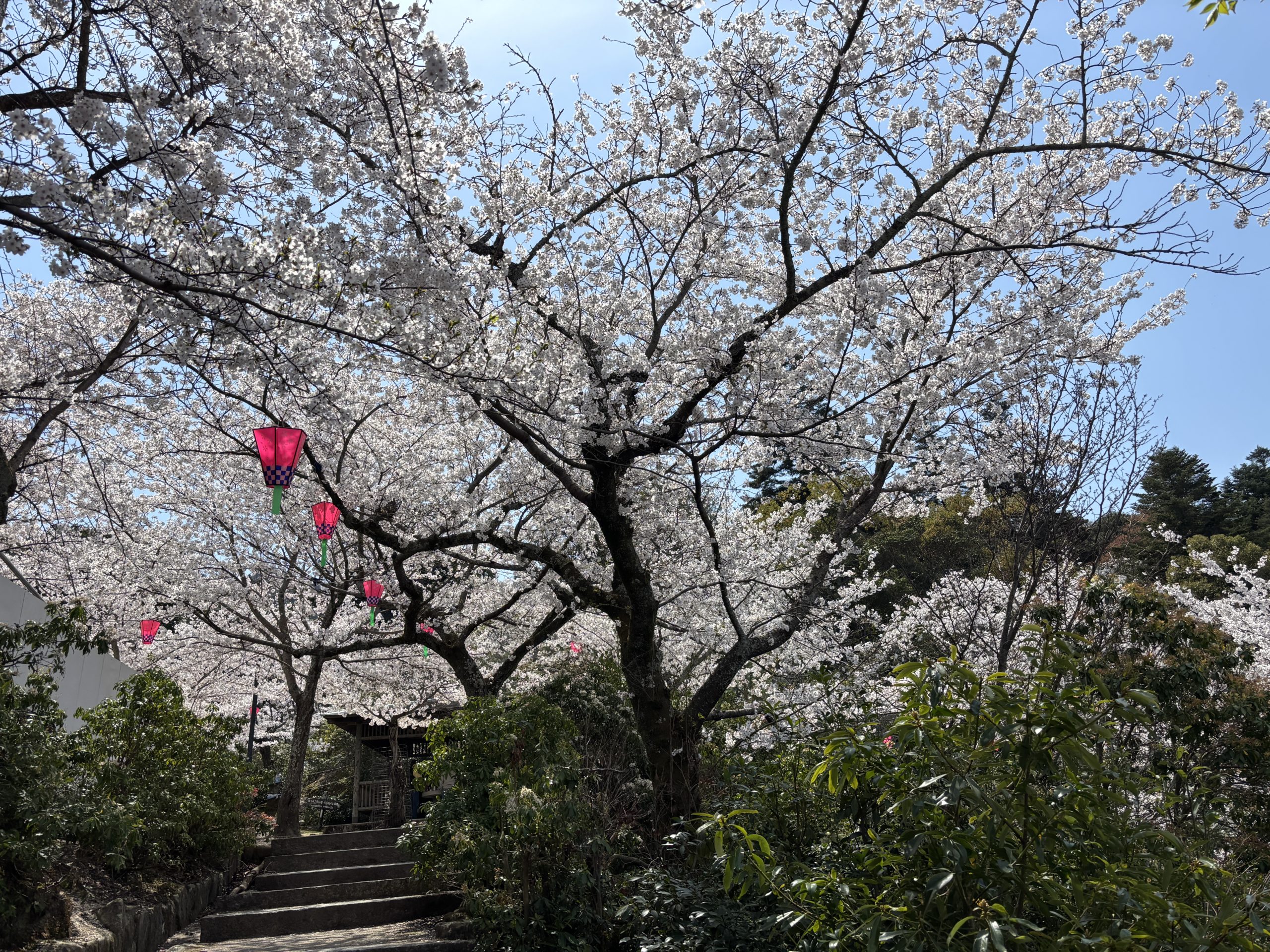 幸(さいわい)神社のそばにある階段を上り、あなごめし「和田」沿いの小道を進み、五十塔を右手に曲がり、小道を登り、「光明院」沿いに進むと誓真大徳碑があります。目印があまりないため、たどり着くのに少し苦労します。でも、頑張ってたどり着くと、海と空と桜の美しい景色に感動できるので苦労した甲斐があります!桜が咲き乱れる中、飾られていたピンクの提灯も印象的です。