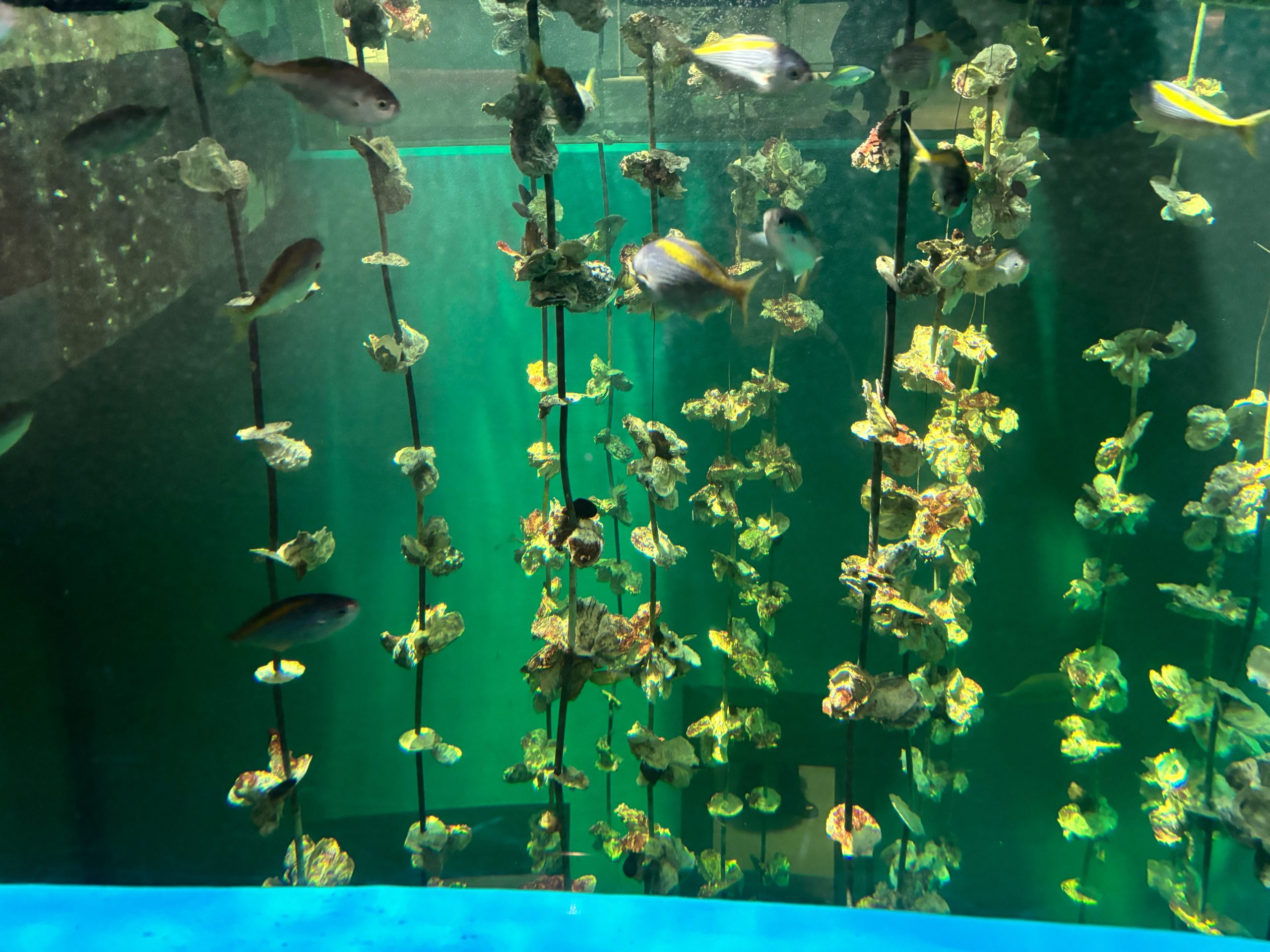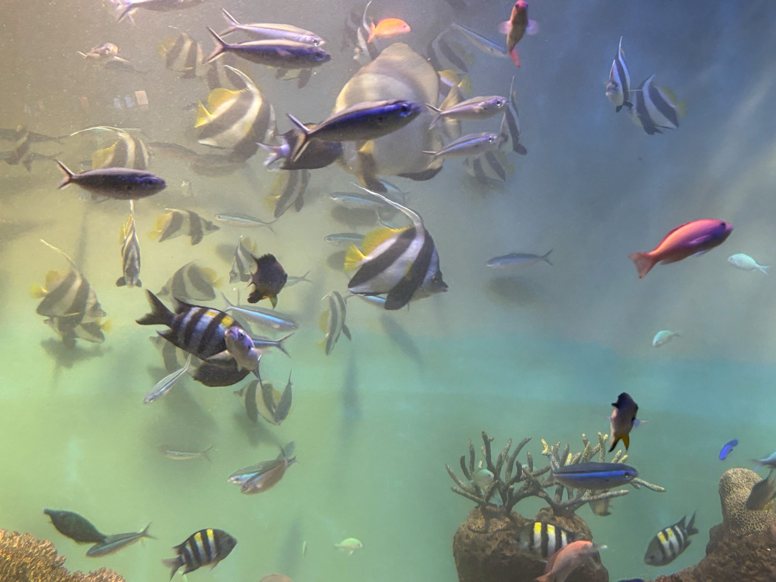2階では、透明の覗き穴がある工夫がされておりタイ、エイ、小魚等が回遊していました。大型水槽にはたくさんの瀬戸内に住む生き物が展示されており、涼やかに回遊する姿は圧巻です。ウツボや牡蠣、カブトムシまで展示されておりバラエティに富んでいます。地元の人に聞くと、牡蠣の展示は宮島の主要産業を紹介するためのものなんだそうです。