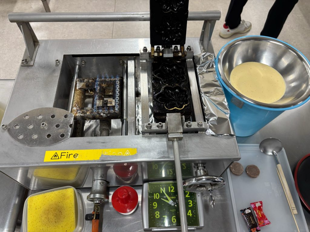 受付後、荷物は棚に置き、手洗い・エプロン着用のうえで体験コーナーへ。各席には生地、あん、板チョコ、計量スプーン、油さし、もみじ饅頭の型が用意されています。安全のため火の扱いや型の取り扱いには注意が必要です。