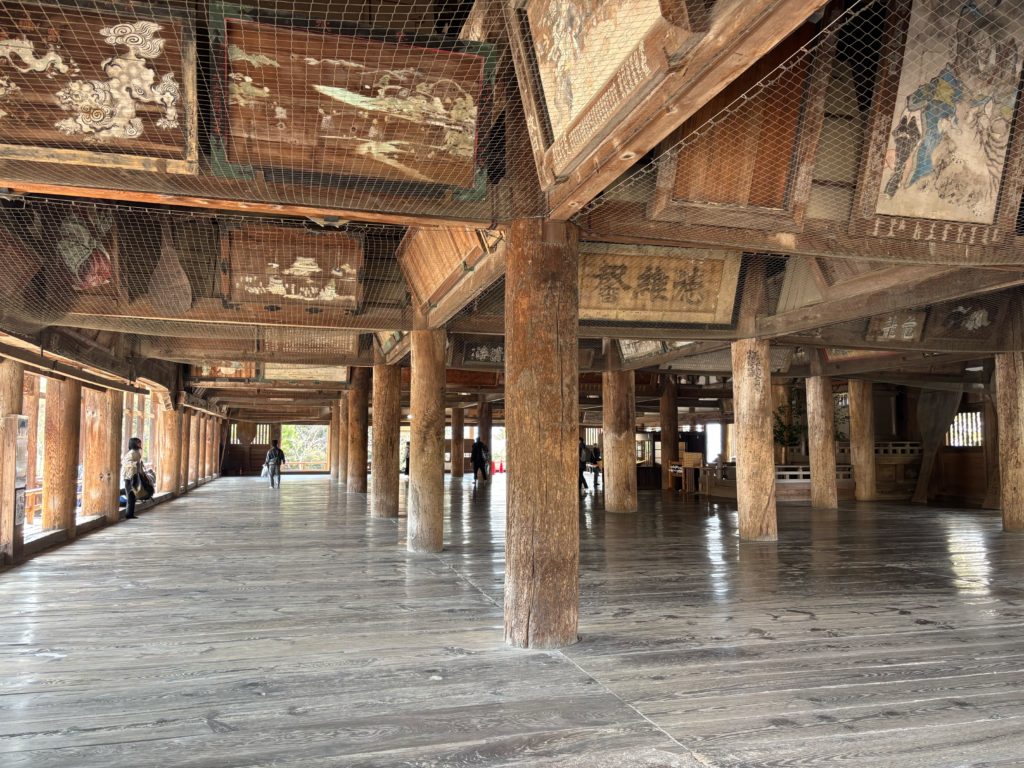 The main hall you see today dates primarily to the early Edo period, though it incorporates elements and techniques from earlier periods. After Taira no Kiyomori’s great construction in the 12th century, fires and typhoons required repeated rebuilding over the centuries. The current configuration was largely established during major repairs undertaken by the Asano clan in 1619 (Genna 5). However, as living wooden architecture, the shrine follows traditional Japanese practice where individual components are periodically replaced using historical techniques rather than the entire structure being rebuilt at once. This means some timbers might be centuries old while others are much newer—all maintained using the same traditional methods. Understanding this helps visitors appreciate that you’re not visiting a museum piece frozen in time but rather a living structure maintained through continuous care.