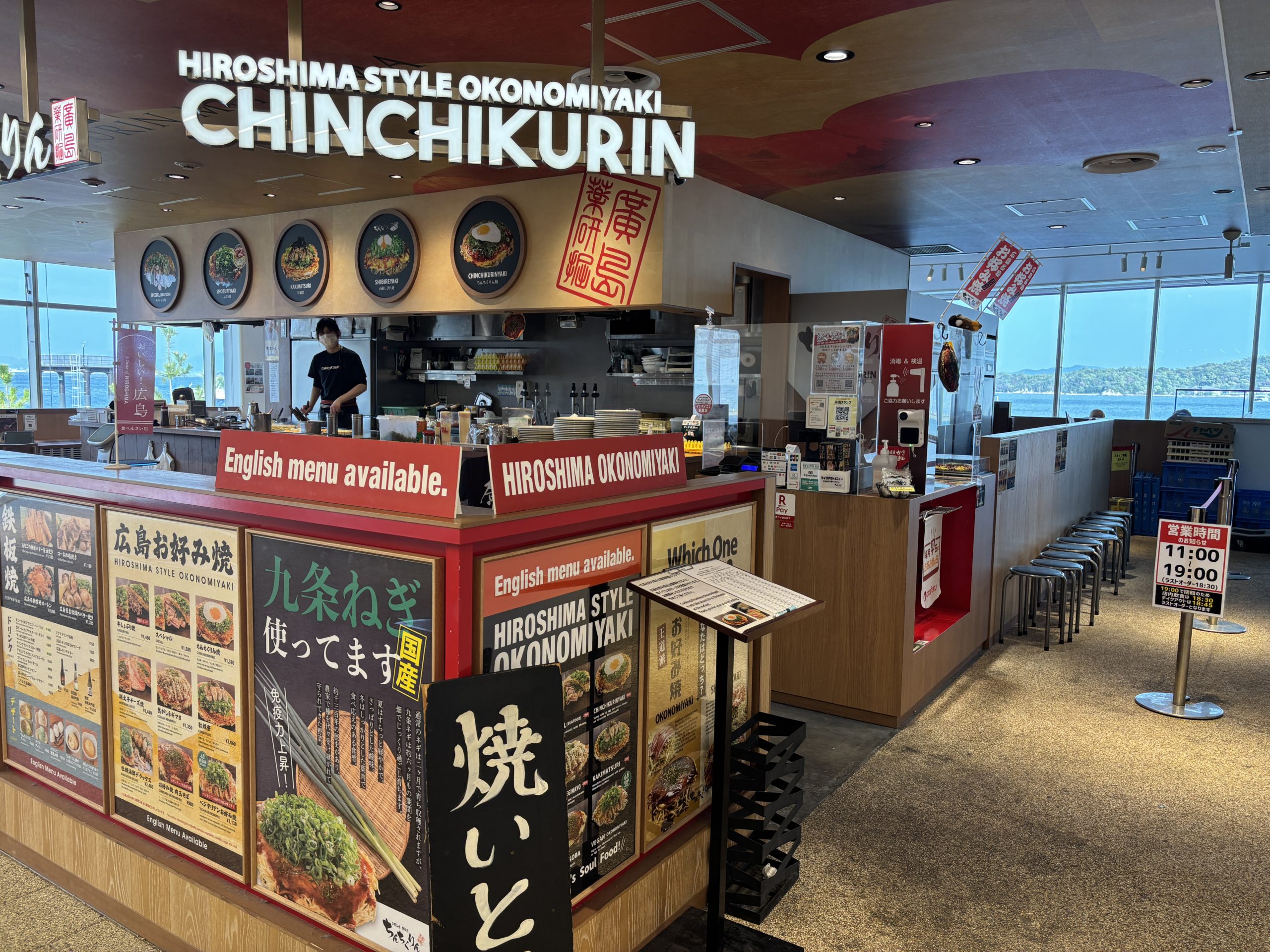 Chinchikurin is a Hiroshima-born okonomiyaki restaurant celebrating its 20th anniversary. Hiroshima-style okonomiyaki is cooked on a 13-meter-long teppan, and both locals and visitors enjoy it while gazing out at the Seto Inland Sea.