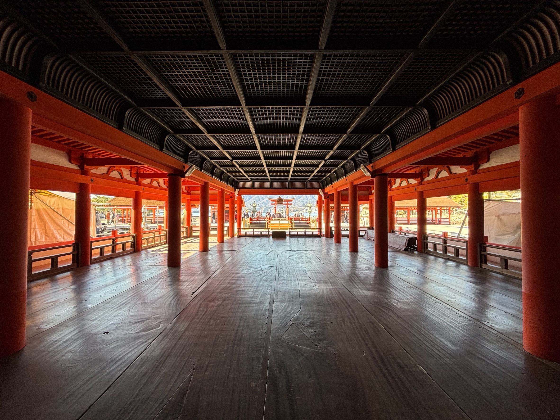 Itsukushima Shrine is recognized as a UNESCO World Heritage Site for its unique architectural design: the shrine buildings stretch dramatically over the sea, with the primeval forest of Mt. Misen rising as a stunning natural backdrop. Built in a location where the scenery transforms completely with the tides, the corridors feature narrow gaps between the floorboards designed to relieve seawater pressure during high tide, and the traditional joinery techniques minimize the use of nails—a testament to centuries of Japanese craftsmanship. Historically, visitors would remove their shoes before entering the main hall; the protective boards you see covering the walkways today were added in later periods so that worshippers could keep their shoes on while walking through the sacred spaces.