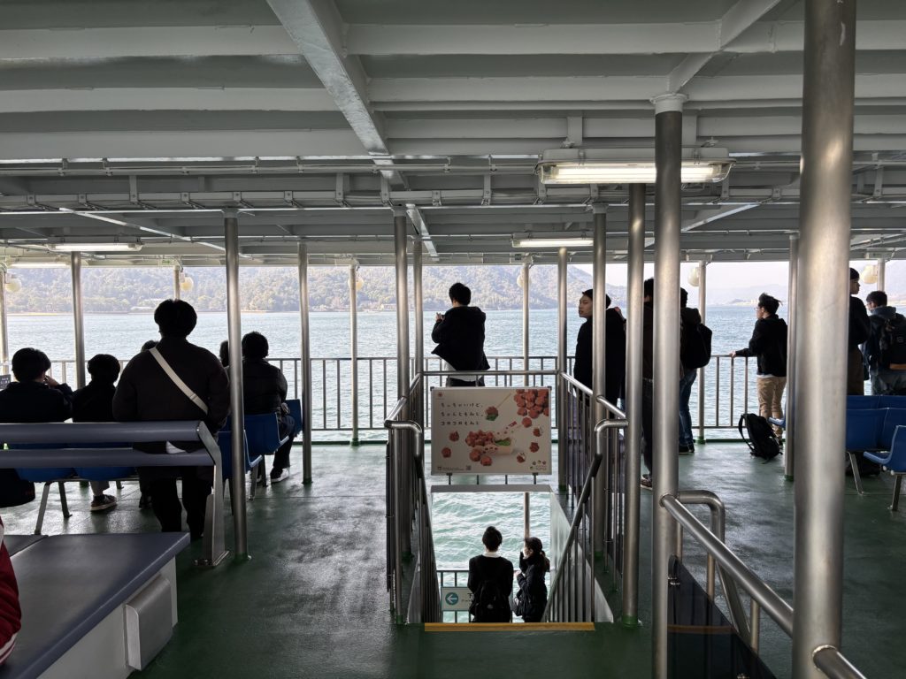 Les ferries fonctionnent selon leur horaire régulier, avec d’éventuels services supplémentaires en période de pointe. Les itinéraires spéciaux qui passent près du Grand Torii peuvent changer selon la marée. Conseil d’habitant : le ferry JR passe plus près du Grand Torii lors des trajets aller.