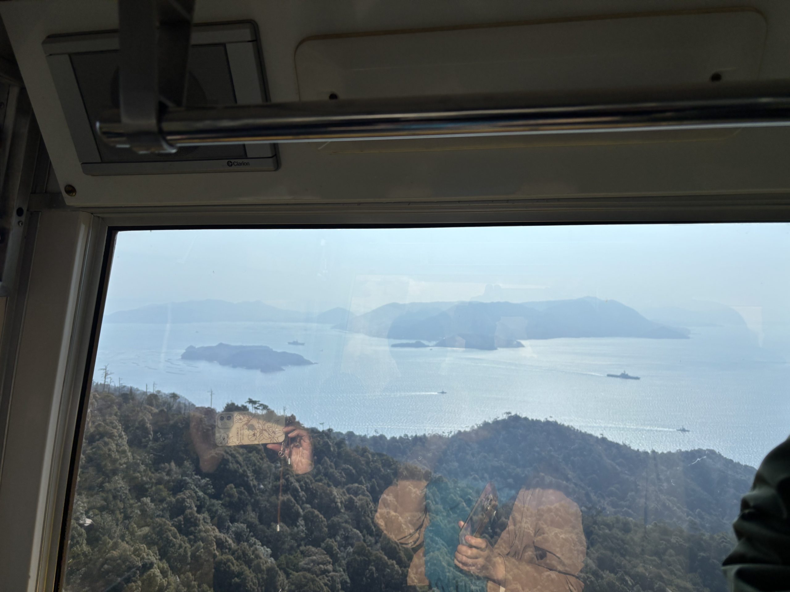 - Vues depuis les fenêtres du téléphérique : À la montée, le côté droit offre les meilleures vues sur l’archipel de la mer intérieure de Seto – mon aîné vise toujours ce siège.