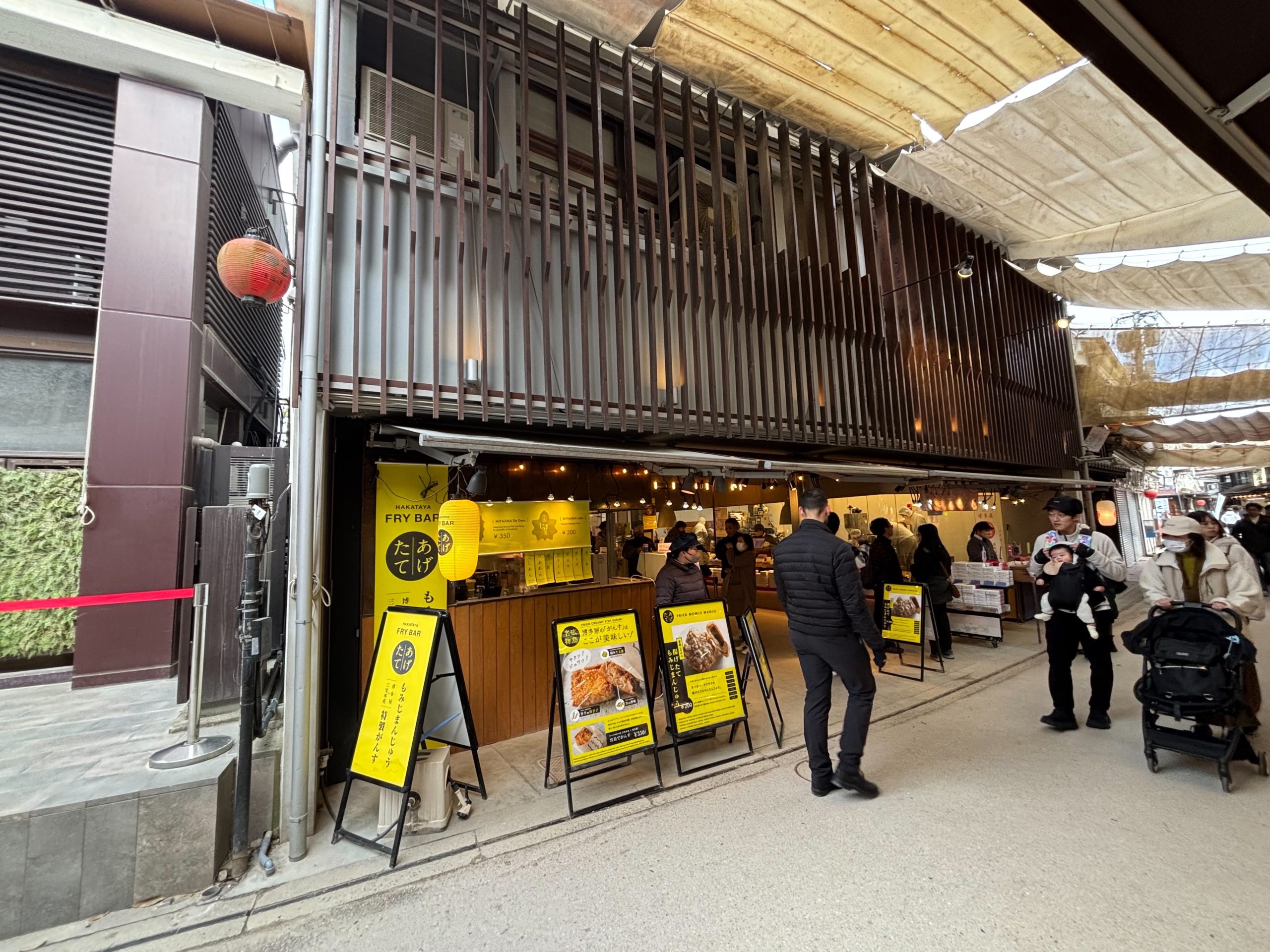 가게 앞에 서면 가장 먼저 눈에 들어오는 건 거대한 주걱 모양의 간판입니다. 미야지마의 특산 기념품이기도 한 주걱(しゃもじ)을 이렇게 크게 내건 가게는 처음 방문하는 여행자에게도 강렬한 첫인상을 남깁니다. 1991년 개업이니 올해로 34년째 이어져 온 셈이고, 입구 처마에 걸린 레트로 풍의 제등(提灯)이 오랜 세월의 분위기를 은근하게 전해줍니다.