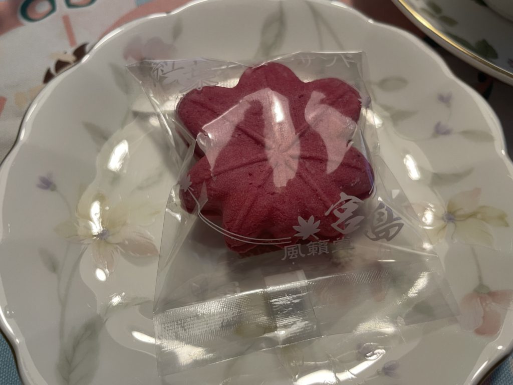 鮮やかなピンク色のもみじバターサンドをいただきました。少しマカロンのようなやや硬めの歯触りで、あっさりとしたバタークリームと爽やかなレモンソースの相性も抜群です。確かにこれまで味わったことのない斬新なお菓子でした。小さく見えますが1個で満足感が得られる仕上がりとなっています。宮島の思い出に浸りながら、午後のティータイムのお供にいいかもしれません。