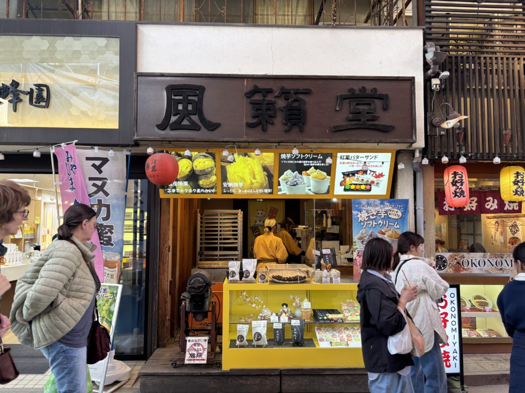 宮島の表参道に「風籟堂 宮島表参道店」があります。国産焼き栗くり香、安納焼き芋、もみじバターサンド、焼き芋ソフトクリームなどを製造販売しています。焼き芋のソフトクリームはTVでも取り上げられた為、大人気だったとか。