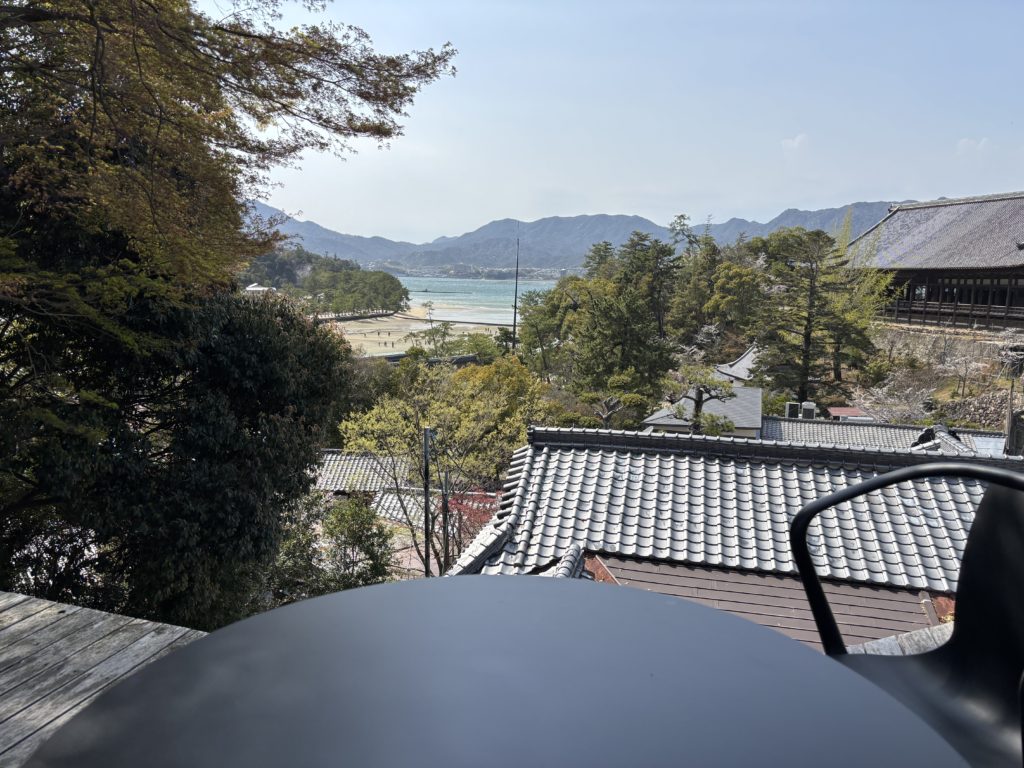 宮島の絶景、千畳閣や五十塔を眺めながらティータイムが楽しめる「天心閣」は、宮島桟橋近くの伊都岐(いつき)珈琲の系列店です。場所は厳島神社の裏側に位置する高台にあるお店です。