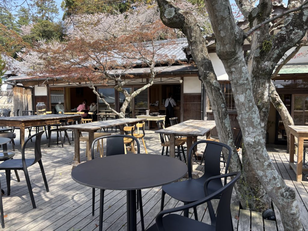 ウッドデッキのテラス席は天気の良い日はとても開放的な気分になれます。自然を感じながらコーヒータイムを過ごせるのは贅沢ですね。BGMなしで、宮島の自然を感じることができます。
