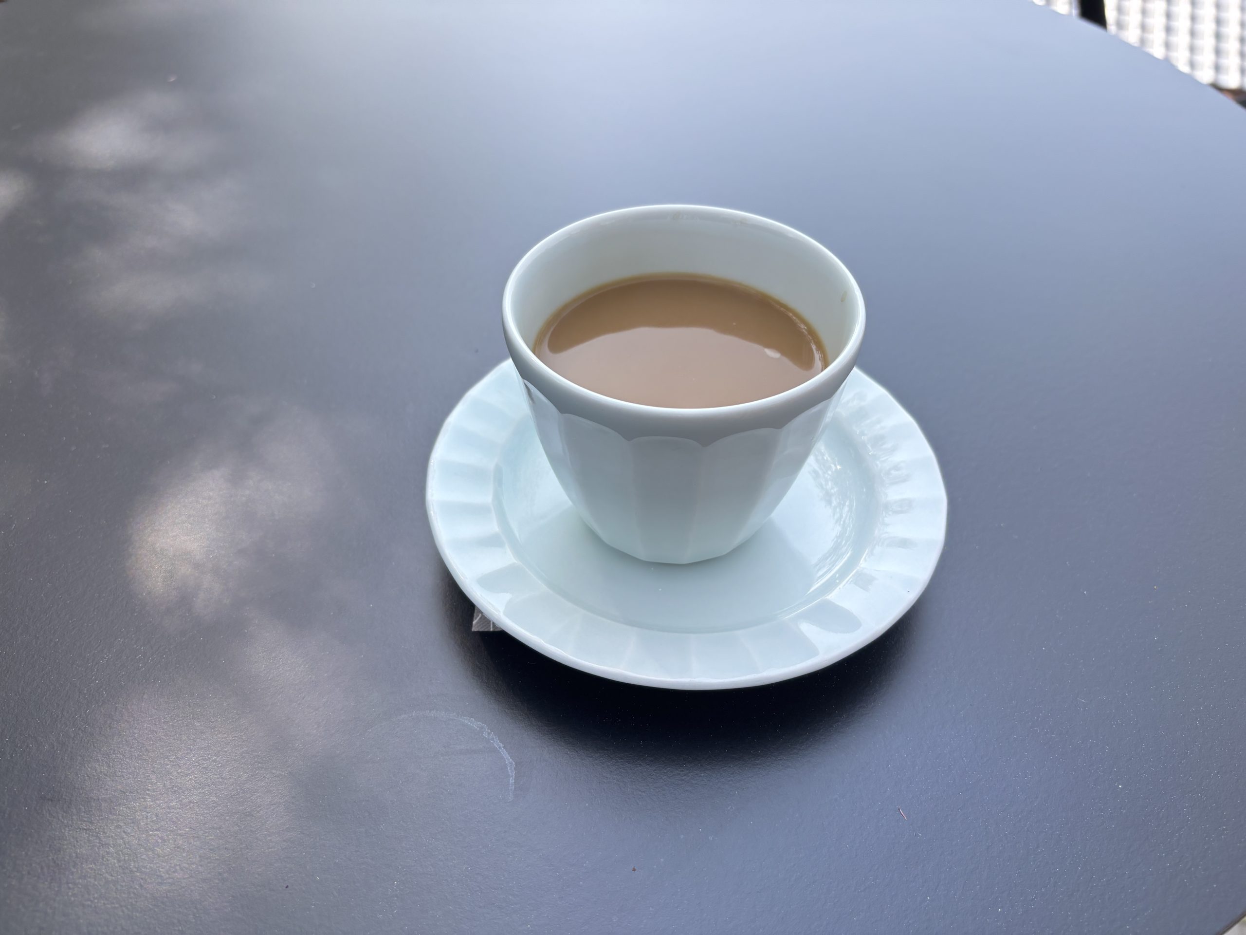 コーヒー(110円税込)は食器もスタイリッシュで、口当たりも良く深煎りされたコーヒーのおいしさが引き立ちます。ホットもコールドも同額で提供されているのも嬉しいポイントの1つです。