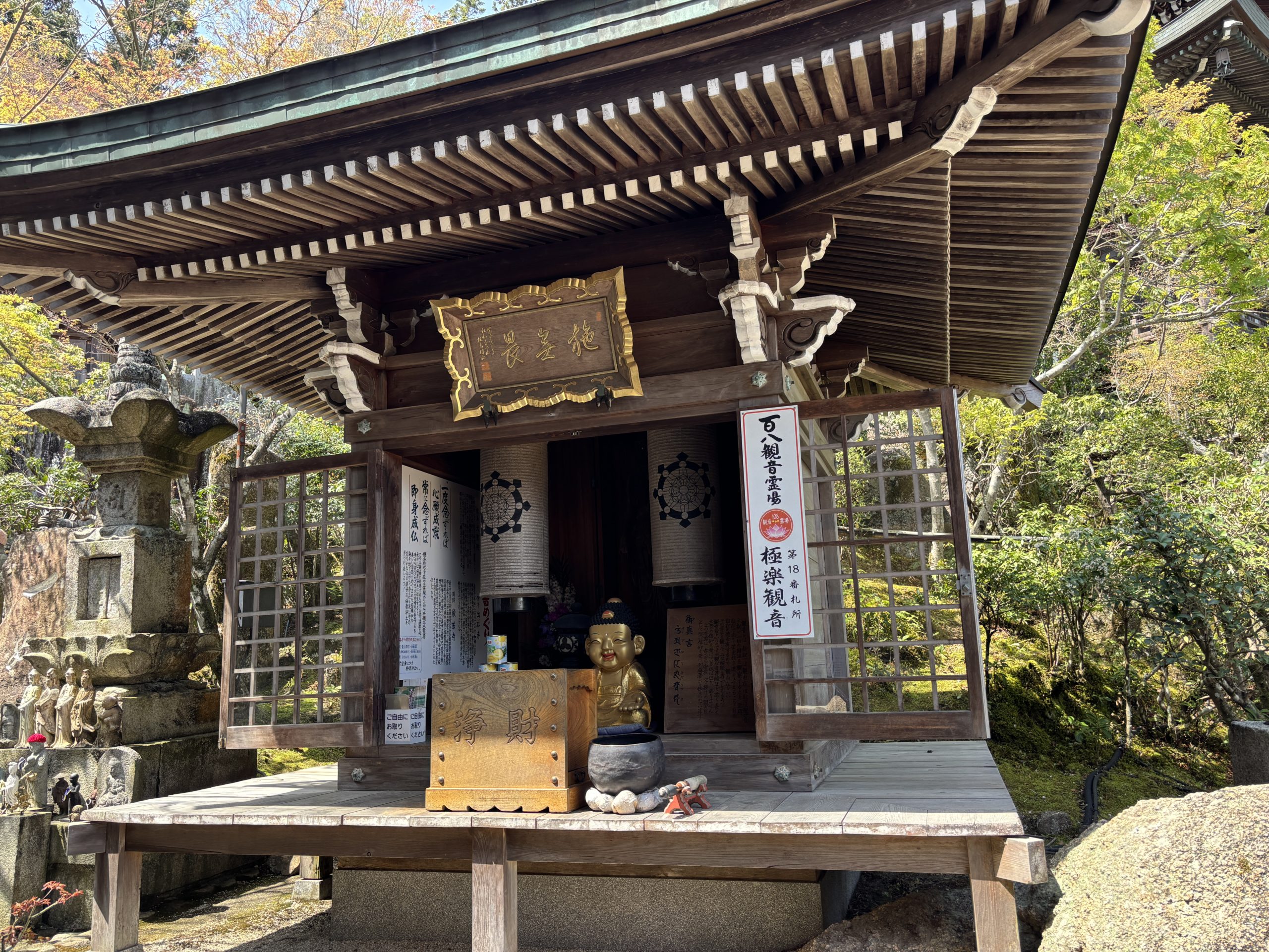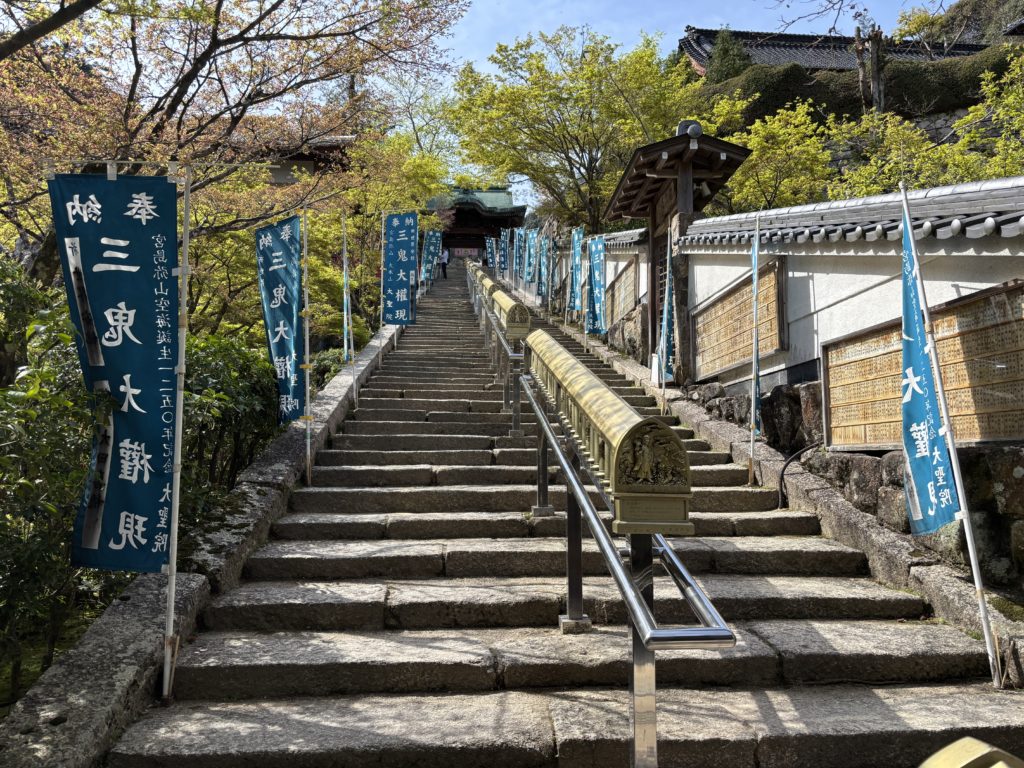 参道のきつい階段を上り、右手の大きな建物が観音堂です。行基菩薩の御作で、元々厳島神社の本地仏である十一面観世音菩薩が安置されています。「はな祭り」ではこちらで甘茶が出されていました。