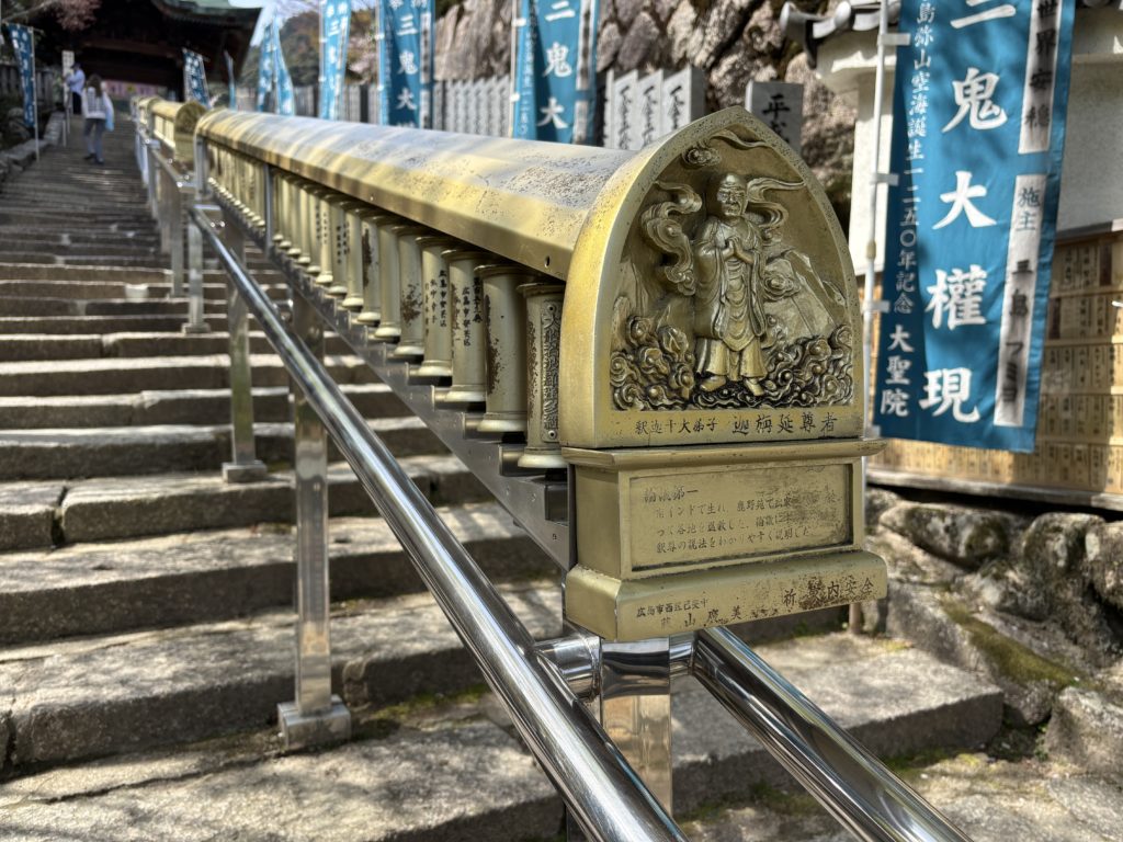 少しきつい階段が続きますが、観音堂までもうひと頑張りです。階段の手すりの上に設置されているマニ車を手で回すと、徳が積めると言われています。