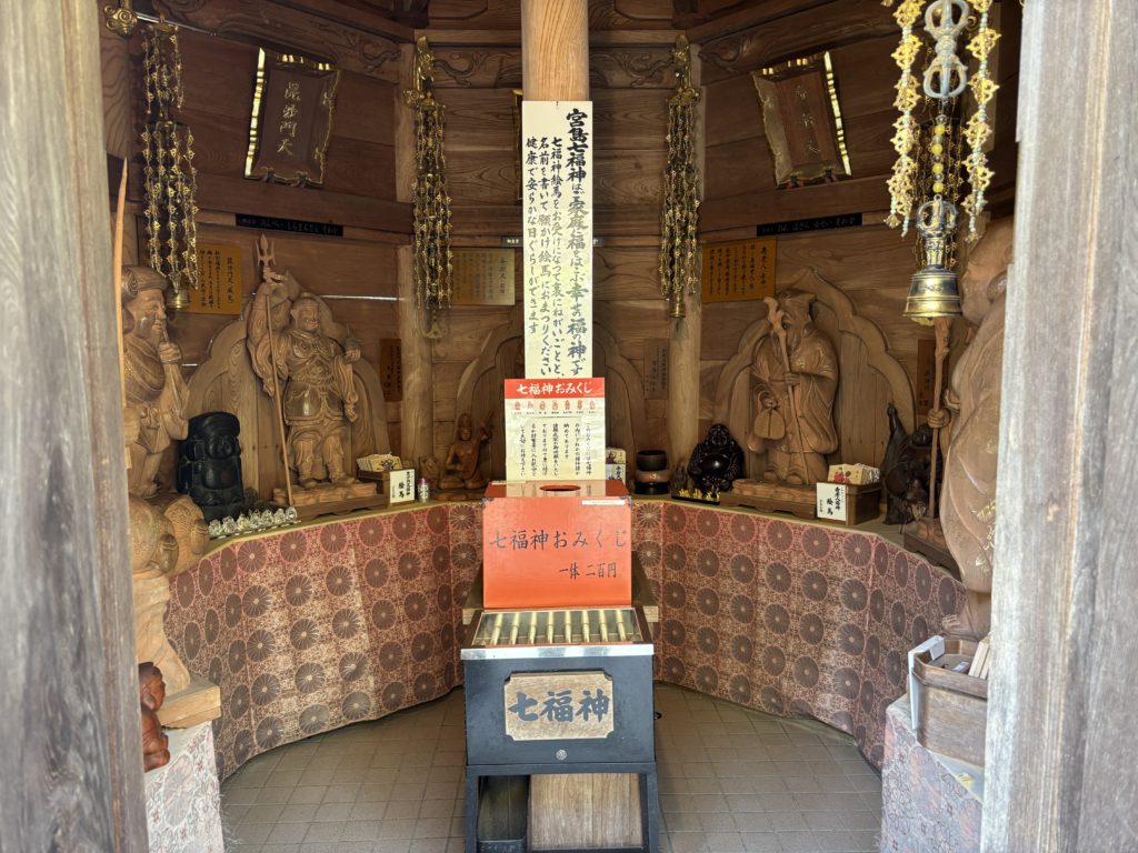 このお堂の中には大黒天、毘沙門天、恵比寿天、寿老人、福禄寿、弁財天、布袋尊の像が安置されており、これらは「宮島七福神」と呼ばれ、「家庭に福をもたらす」と言われています。家内安全などの有難いご利益があるそうです。